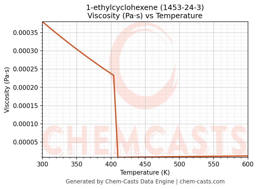 This page presents the temperature-dependent thermodynamic and transport properties of 1-ethylcyclohexene (CAS 1453-24-3) calculated at a constant pressure of 1 atm (101325 Pa) over the temperature range 250-500 K.