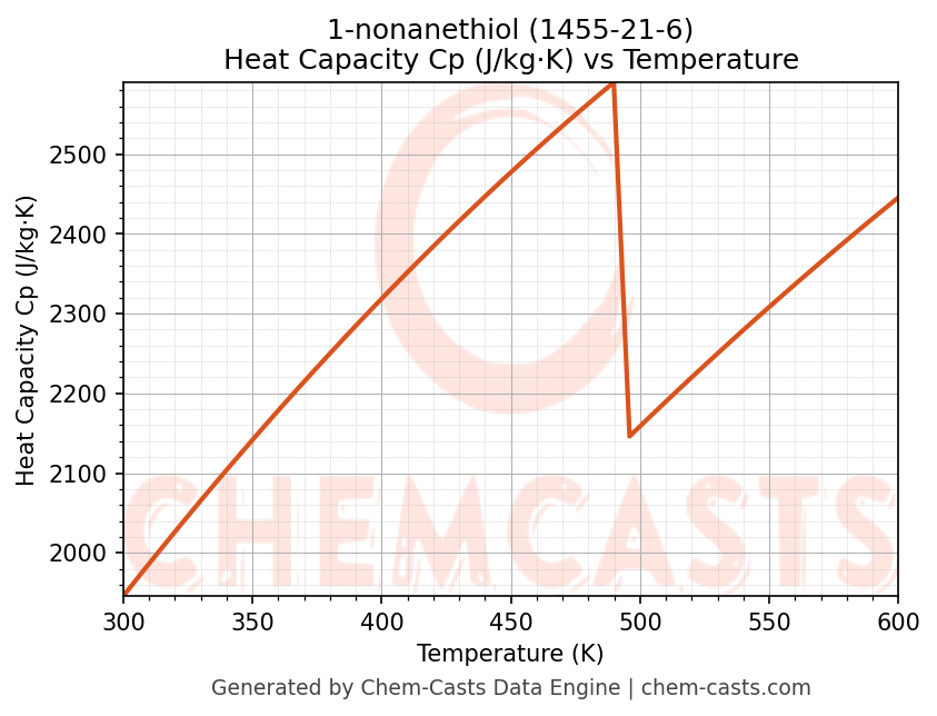 - Specific heat capacity (Cp) indicates the amount of energy required to raise the temperature of 1-nonanethiol and is critical for energy balance and heat-exchanger design.