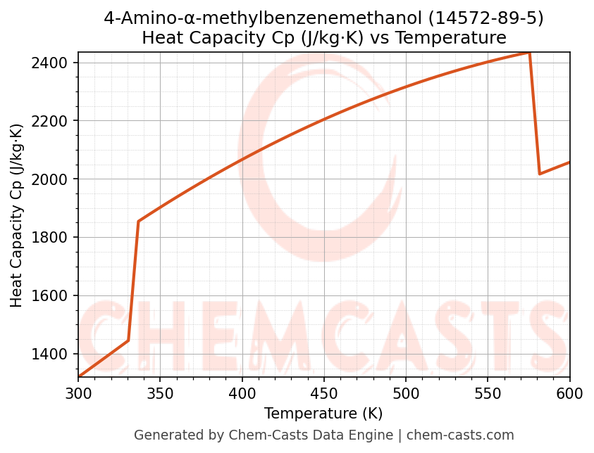 - Specific heat capacity (Cp) indicates the amount of energy required to raise the temperature of 4-Amino-α-methylbenzenemethanol and is critical for energy balance and heat-exchanger design.
