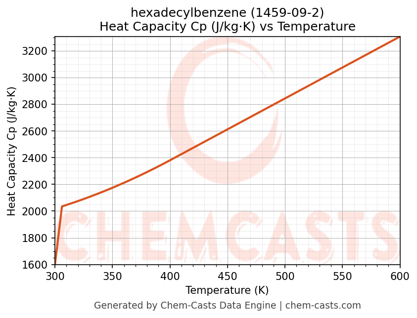 - Specific heat capacity (Cp) indicates the amount of energy required to raise the temperature of hexadecylbenzene and is critical for energy balance and heat-exchanger design.