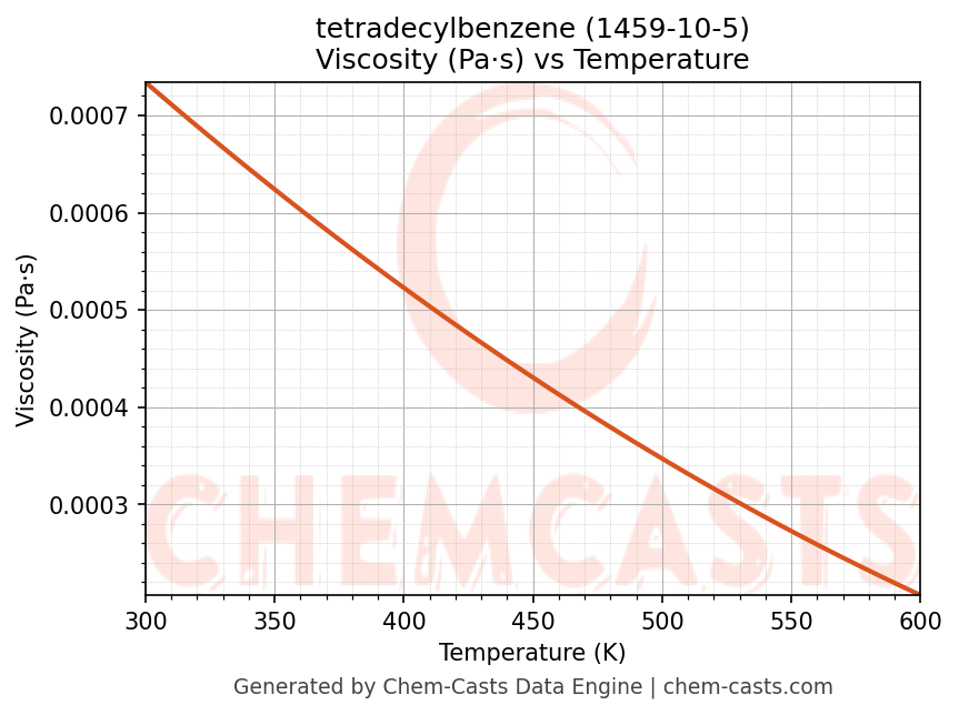 This page presents the temperature-dependent thermodynamic and transport properties of tetradecylbenzene (CAS 1459-10-5) calculated at a constant pressure of 1 atm (101325 Pa) over the temperature range 250-500 K.