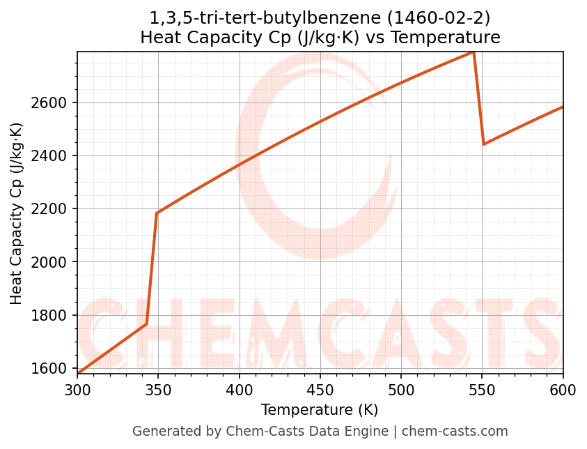 - Specific heat capacity (Cp) indicates the amount of energy required to raise the temperature of 1,3,5-tri-tert-butylbenzene and is critical for energy balance and heat-exchanger design.