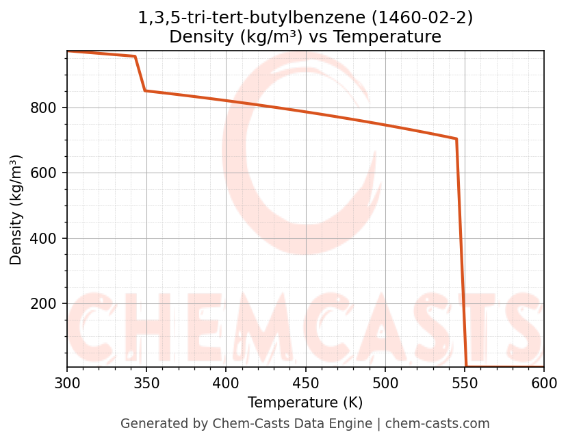 This page presents the temperature-dependent thermodynamic and transport properties of 1,3,5-tri-tert-butylbenzene (CAS 1460-02-2) calculated at a constant pressure of 1 atm (101325 Pa) over the temperature range 250-500 K.