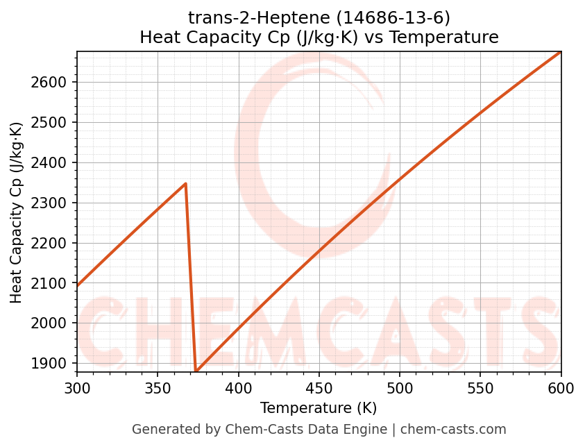 - Specific heat capacity (Cp) indicates the amount of energy required to raise the temperature of trans-2-Heptene and is critical for energy balance and heat-exchanger design.