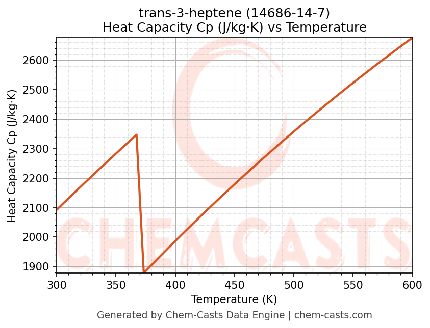 - Specific heat capacity (Cp) indicates the amount of energy required to raise the temperature of trans-3-heptene and is critical for energy balance and heat-exchanger design.