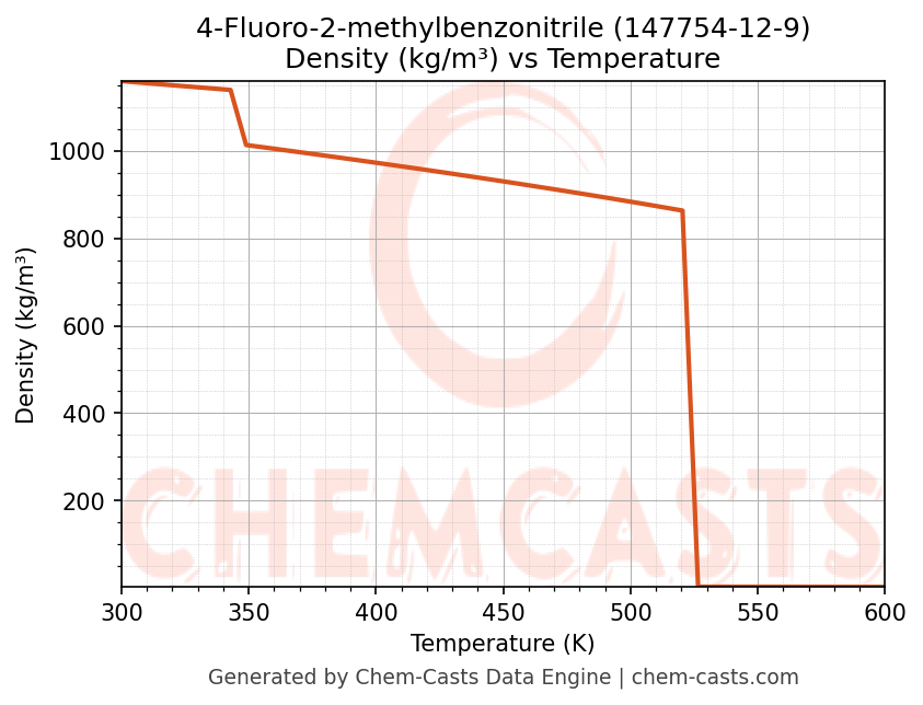 This page presents the temperature-dependent thermodynamic and transport properties of 4-Fluoro-2-methylbenzonitrile (CAS 147754-12-9) calculated at a constant pressure of 1 atm (101325 Pa) over the temperature range 250-500 K.