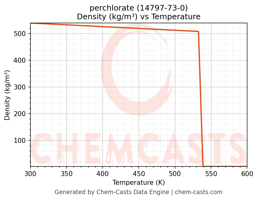 This page presents the temperature-dependent thermodynamic and transport properties of perchlorate (CAS 14797-73-0) calculated at a constant pressure of 1 atm (101325 Pa) over the temperature range 250-500 K.