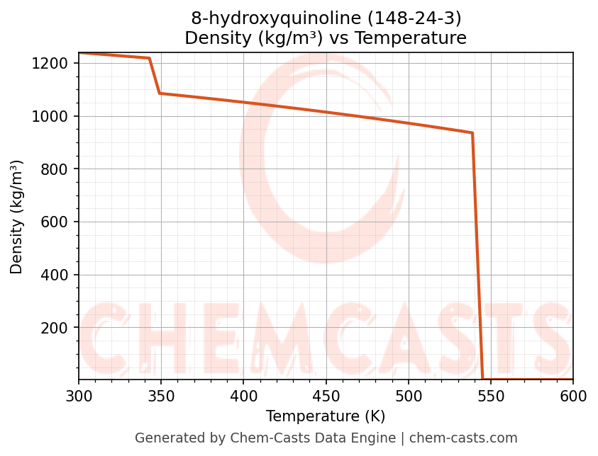 This page presents the temperature-dependent thermodynamic and transport properties of 8-hydroxyquinoline (CAS 148-24-3) calculated at a constant pressure of 1 atm (101325 Pa) over the temperature range 250-500 K.