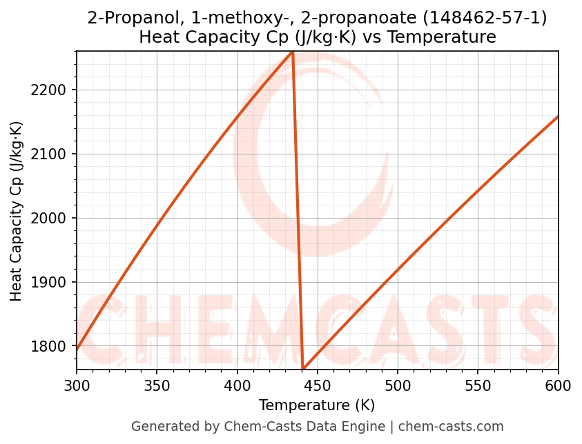 - Specific heat capacity (Cp) indicates the amount of energy required to raise the temperature of 2-Propanol, 1-methoxy-, 2-propanoate and is critical for energy balance and heat-exchanger design.