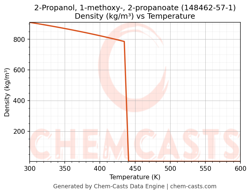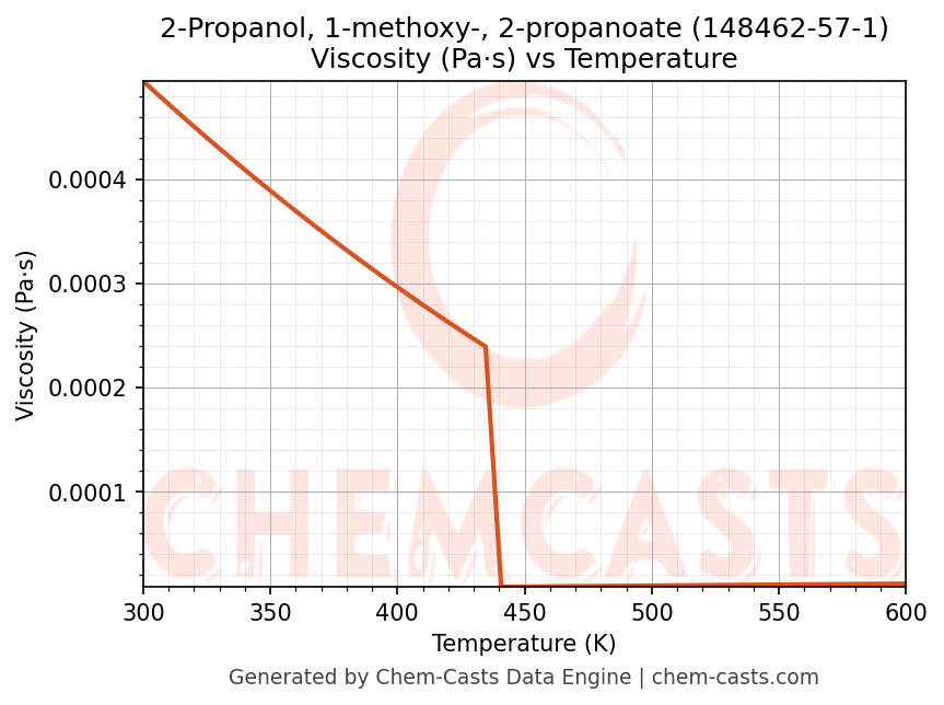 This page presents the temperature-dependent thermodynamic and transport properties of 2-Propanol, 1-methoxy-, 2-propanoate (CAS 148462-57-1) calculated at a constant pressure of 1 atm (101325 Pa) over the temperature range 250-500 K.