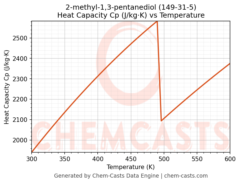 - Specific heat capacity (Cp) indicates the amount of energy required to raise the temperature of 2-methyl-1,3-pentanediol and is critical for energy balance and heat-exchanger design.