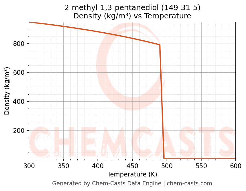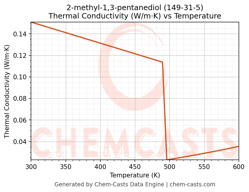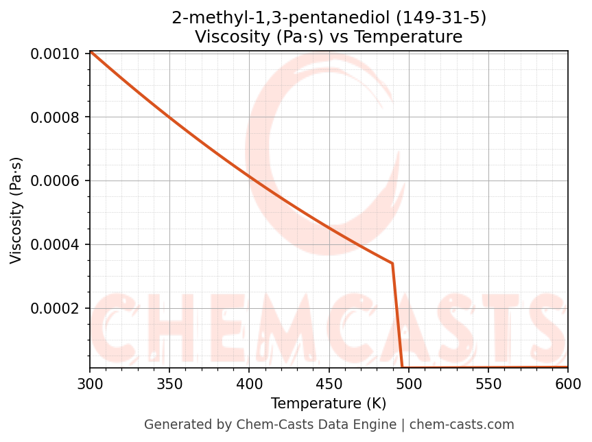 This page presents the temperature-dependent thermodynamic and transport properties of 2-methyl-1,3-pentanediol (CAS 149-31-5) calculated at a constant pressure of 1 atm (101325 Pa) over the temperature range 250-500 K.