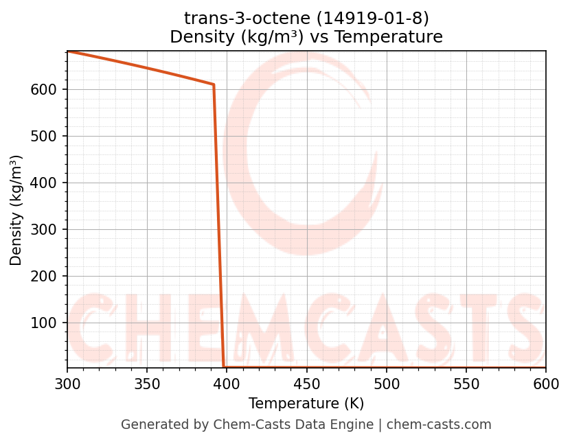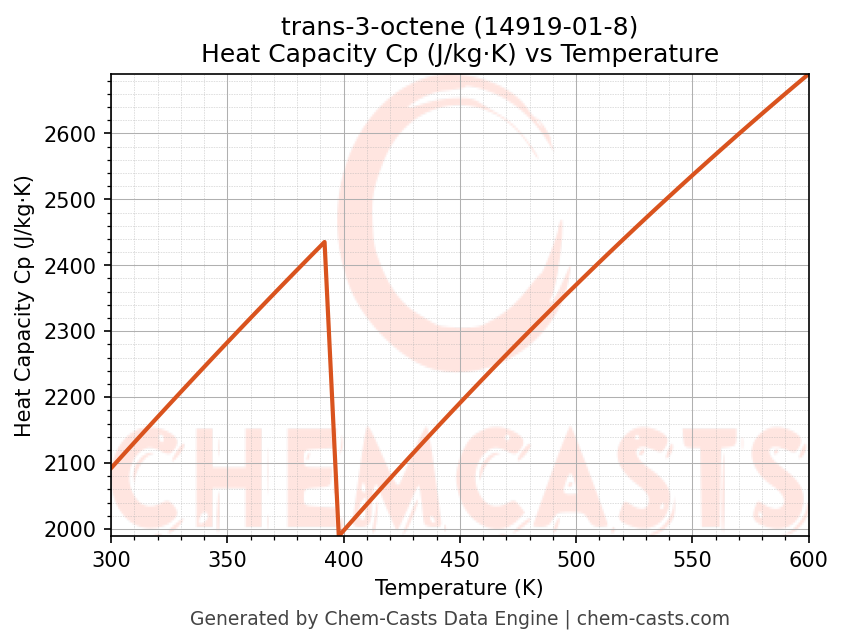 - Specific heat capacity (Cp) indicates the amount of energy required to raise the temperature of trans-3-octene and is critical for energy balance and heat-exchanger design.