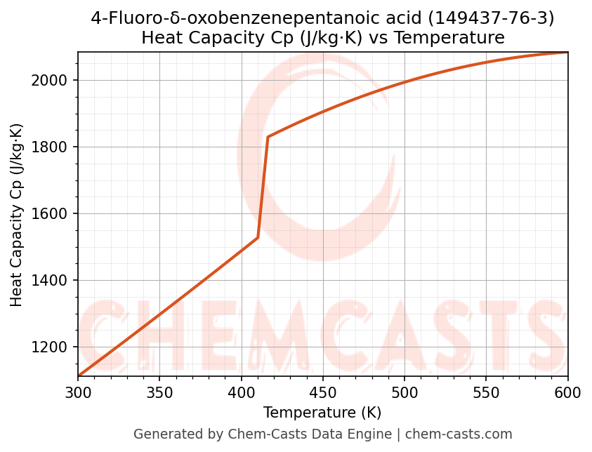 - Specific heat capacity (Cp) indicates the amount of energy required to raise the temperature of 4-Fluoro-δ-oxobenzenepentanoic acid and is critical for energy balance and heat-exchanger design.