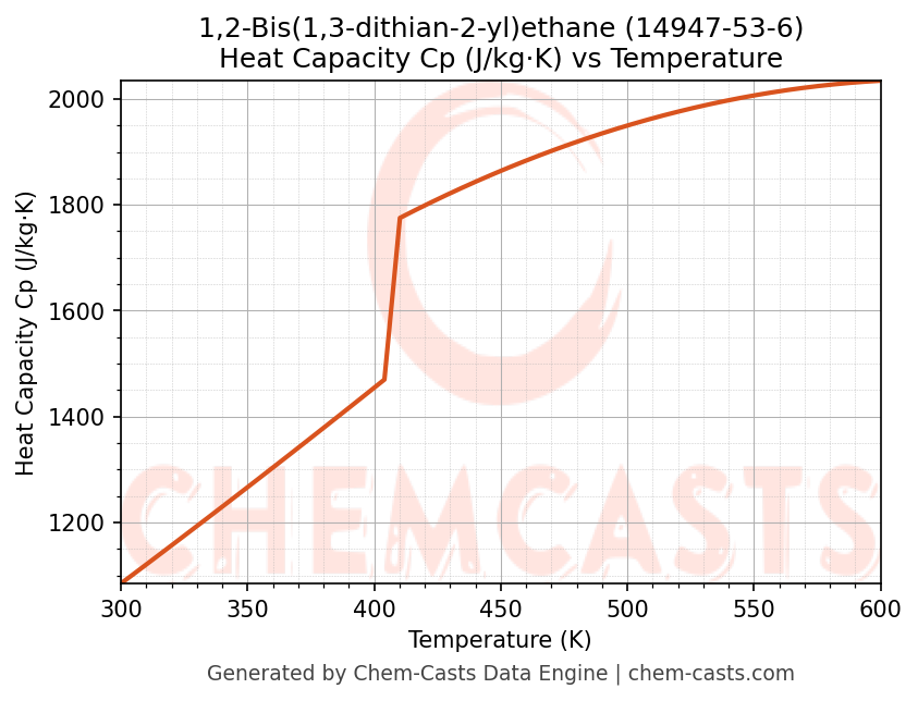 - Specific heat capacity (Cp) indicates the amount of energy required to raise the temperature of 1,2-Bis(1,3-dithian-2-yl)ethane and is critical for energy balance and heat-exchanger design.