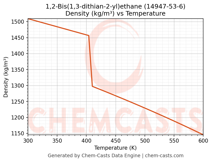 This page presents the temperature-dependent thermodynamic and transport properties of 1,2-Bis(1,3-dithian-2-yl)ethane (CAS 14947-53-6) calculated at a constant pressure of 1 atm (101325 Pa) over the temperature range 250-500 K.