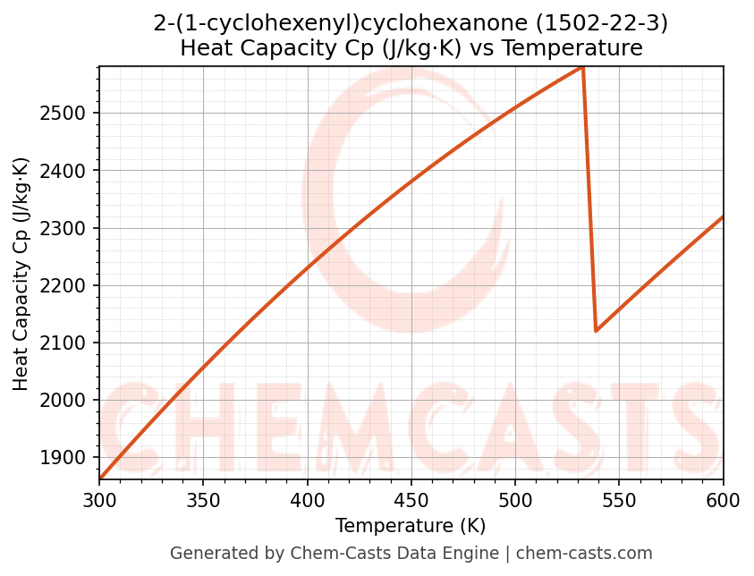 - Specific heat capacity (Cp) indicates the amount of energy required to raise the temperature of 2-(1-cyclohexenyl)cyclohexanone and is critical for energy balance and heat-exchanger design.
