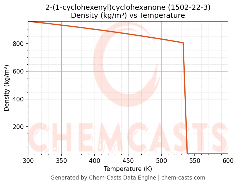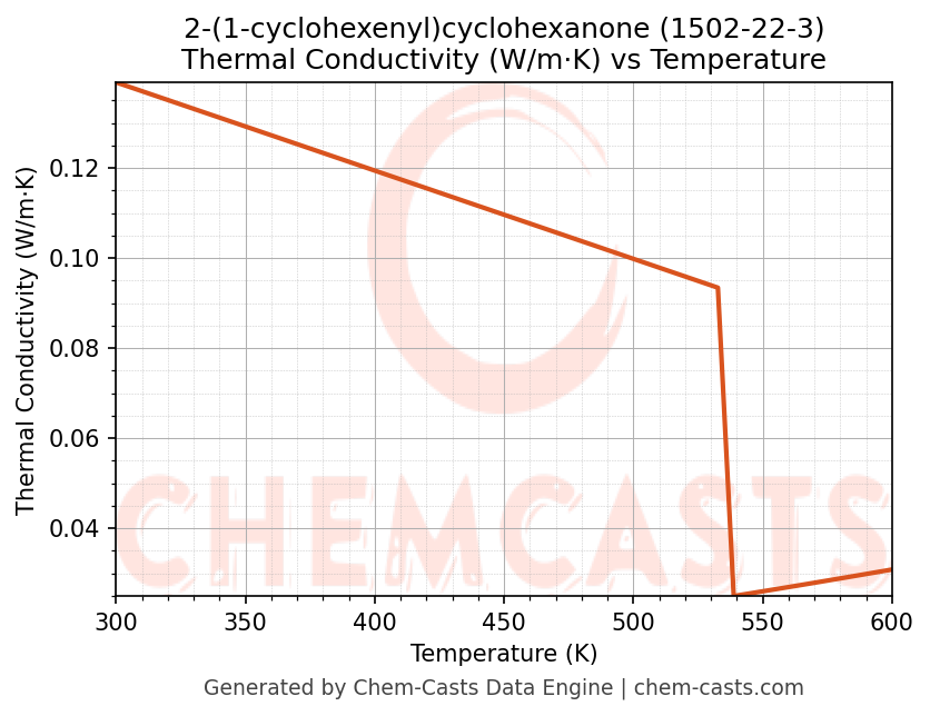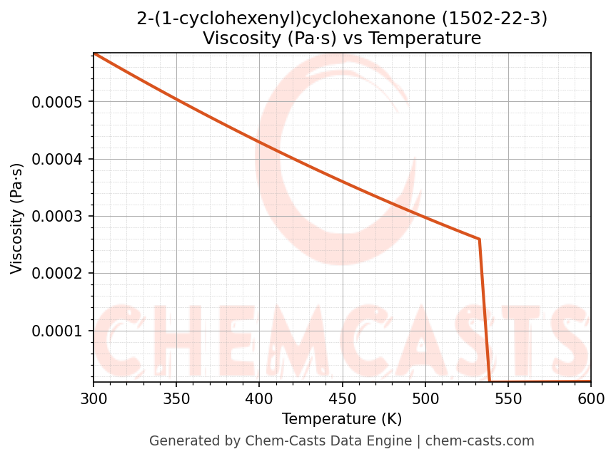 This page presents the temperature-dependent thermodynamic and transport properties of 2-(1-cyclohexenyl)cyclohexanone (CAS 1502-22-3) calculated at a constant pressure of 1 atm (101325 Pa) over the temperature range 250-500 K.