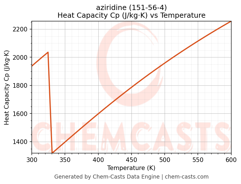 - Specific heat capacity (Cp) indicates the amount of energy required to raise the temperature of aziridine and is critical for energy balance and heat-exchanger design.