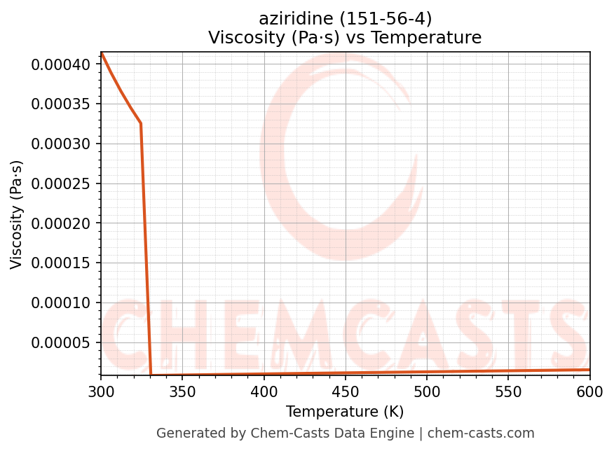 This page presents the temperature-dependent thermodynamic and transport properties of aziridine (CAS 151-56-4) calculated at a constant pressure of 1 atm (101325 Pa) over the temperature range 250-500 K.