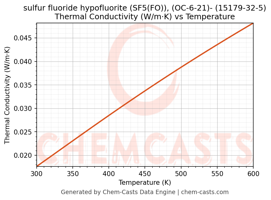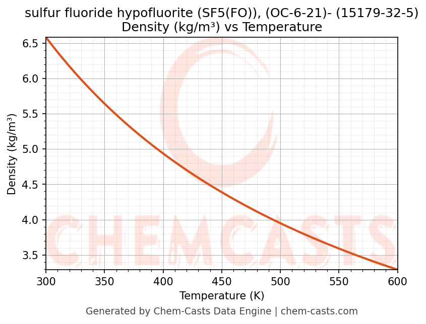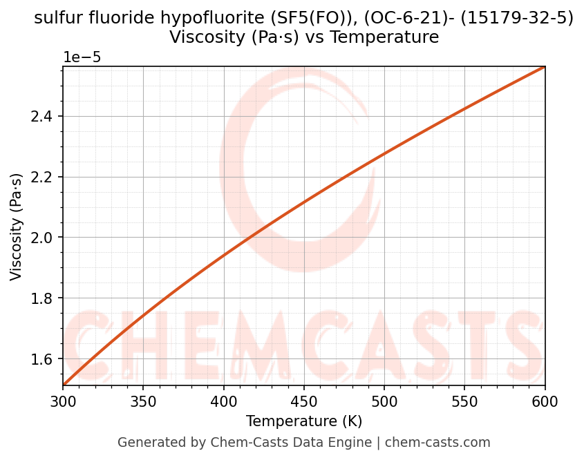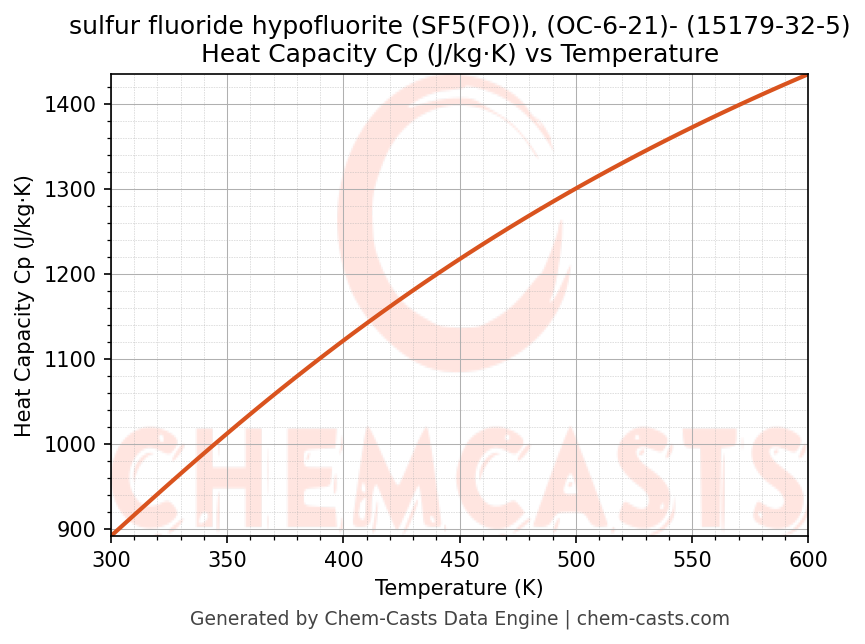 - Specific heat capacity (Cp) indicates the amount of energy required to raise the temperature of sulfur fluoride hypofluorite (SF5(FO)), (OC-6-21)- and is critical for energy balance and heat-exchanger design.
