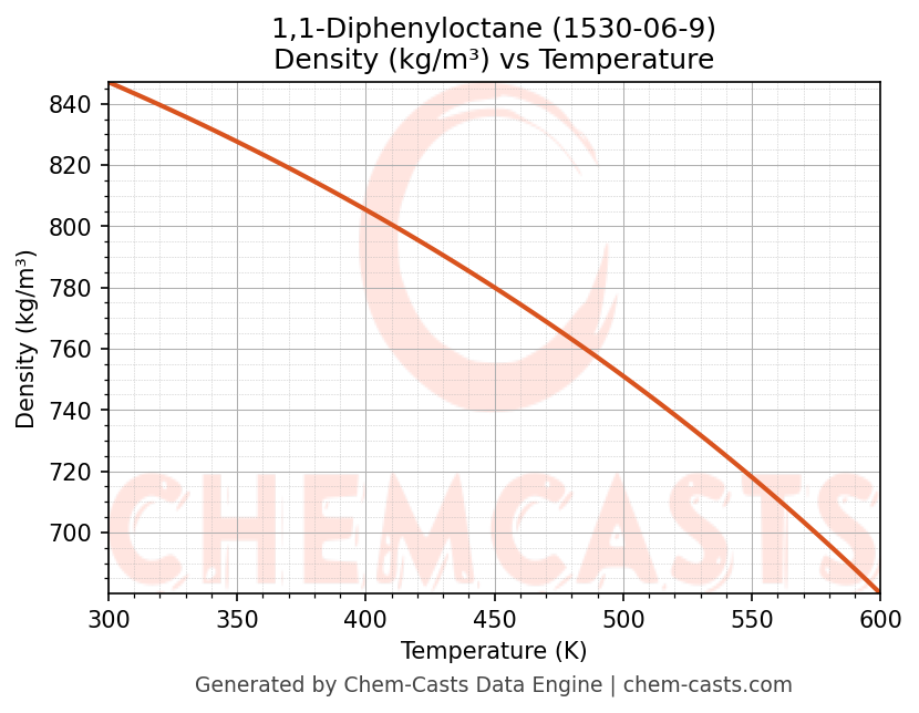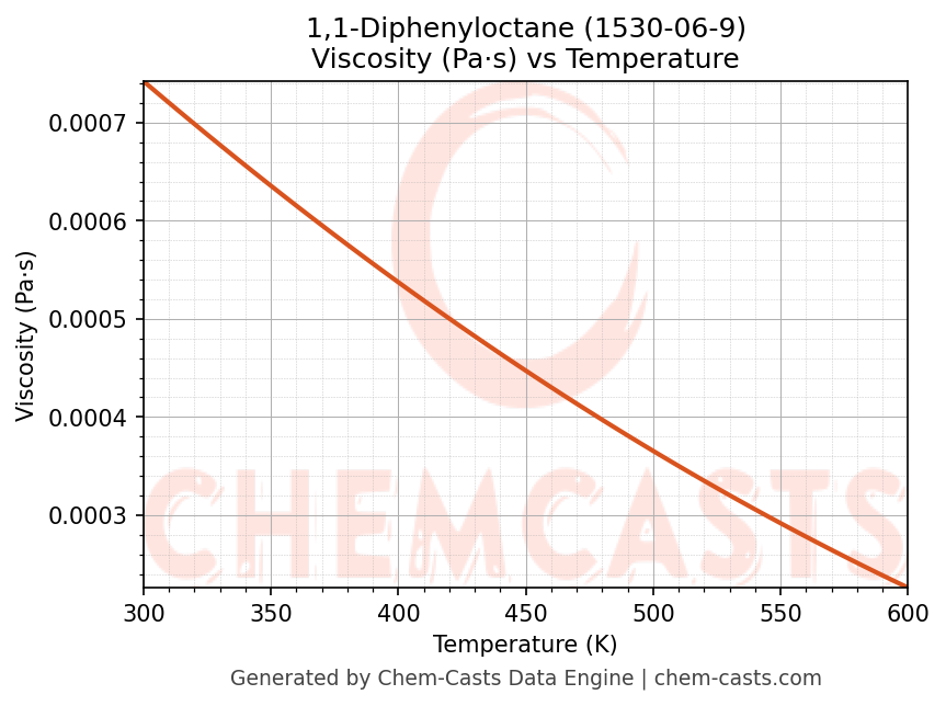 This page presents the temperature-dependent thermodynamic and transport properties of 1,1-Diphenyloctane (CAS 1530-06-9) calculated at a constant pressure of 1 atm (101325 Pa) over the temperature range 250-500 K.