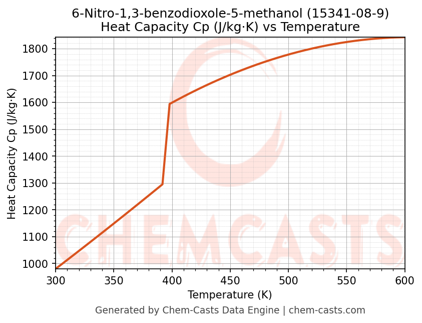 - Specific heat capacity (Cp) indicates the amount of energy required to raise the temperature of 6-Nitro-1,3-benzodioxole-5-methanol and is critical for energy balance and heat-exchanger design.