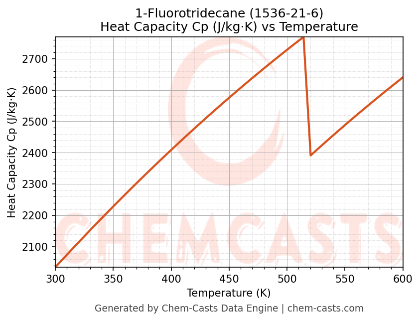 - Specific heat capacity (Cp) indicates the amount of energy required to raise the temperature of 1-Fluorotridecane and is critical for energy balance and heat-exchanger design.