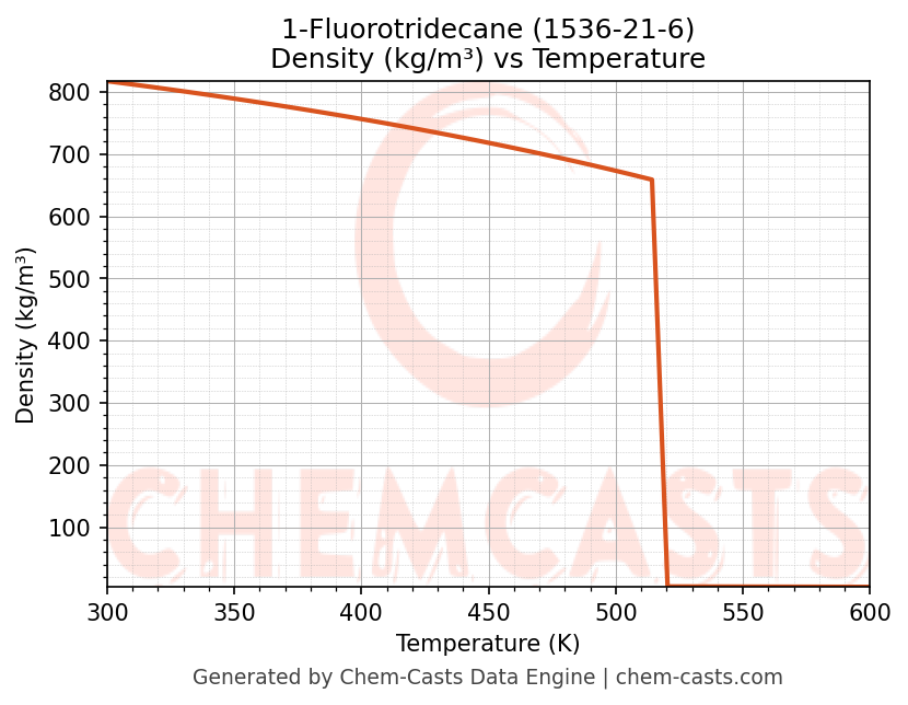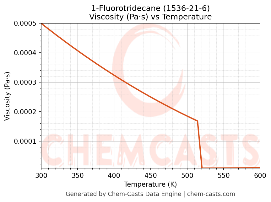 This page presents the temperature-dependent thermodynamic and transport properties of 1-Fluorotridecane (CAS 1536-21-6) calculated at a constant pressure of 1 atm (101325 Pa) over the temperature range 250-500 K.