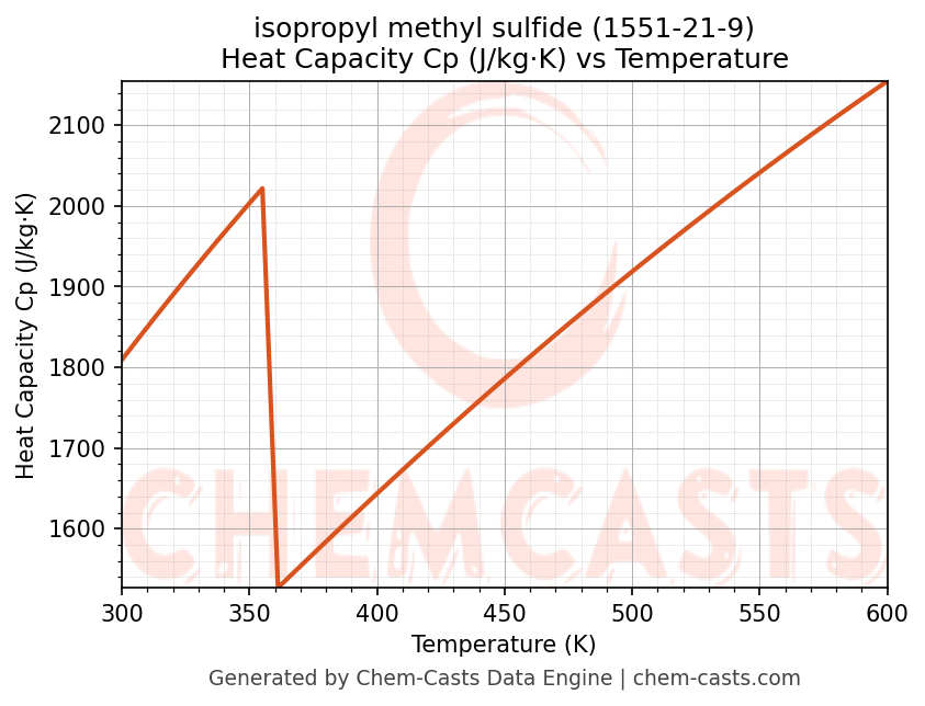 - Specific heat capacity (Cp) indicates the amount of energy required to raise the temperature of isopropyl methyl sulfide and is critical for energy balance and heat-exchanger design.