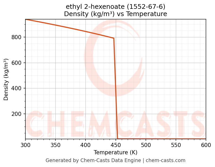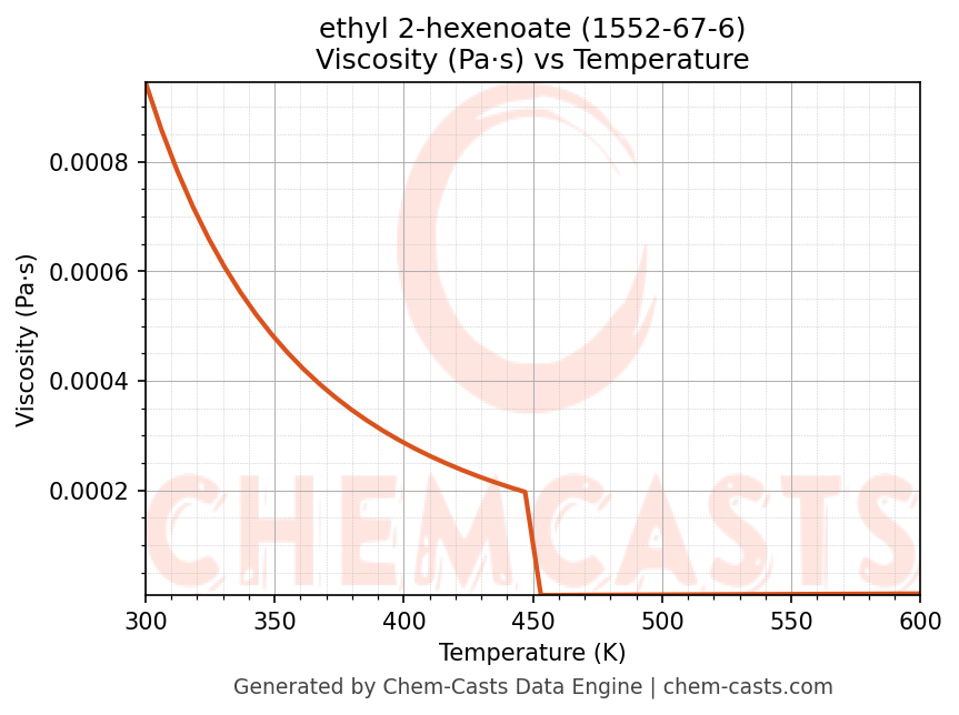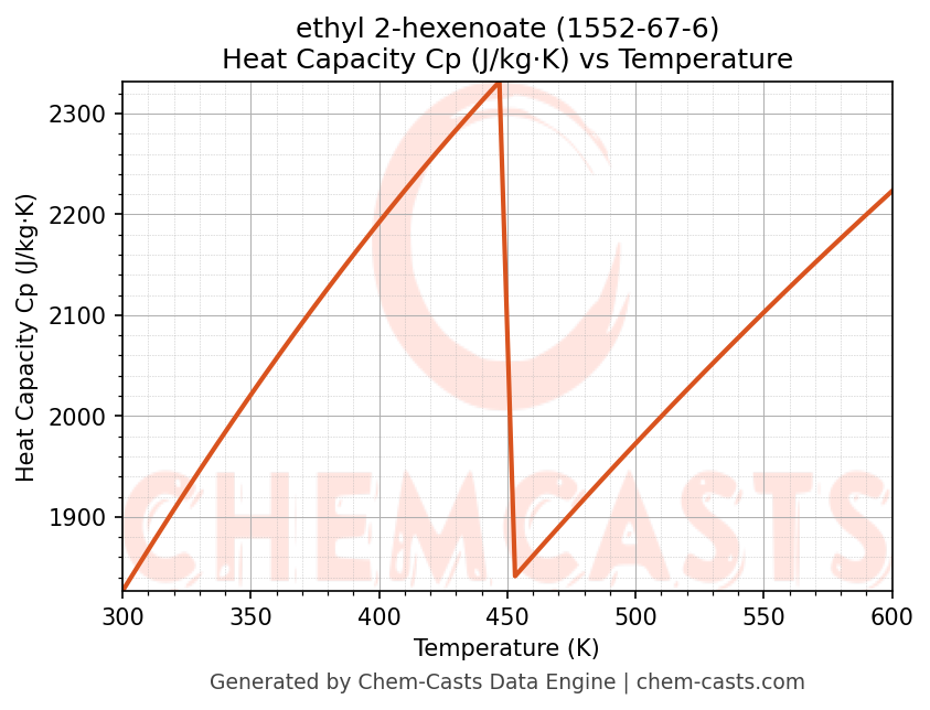 This page presents the temperature-dependent thermodynamic and transport properties of ethyl 2-hexenoate (CAS 1552-67-6) calculated at a constant pressure of 1 atm (101325 Pa) over the temperature range 250-500 K.