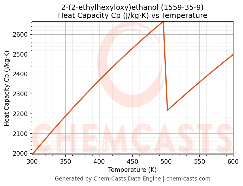 - Specific heat capacity (Cp) indicates the amount of energy required to raise the temperature of 2-(2-ethylhexyloxy)ethanol and is critical for energy balance and heat-exchanger design.