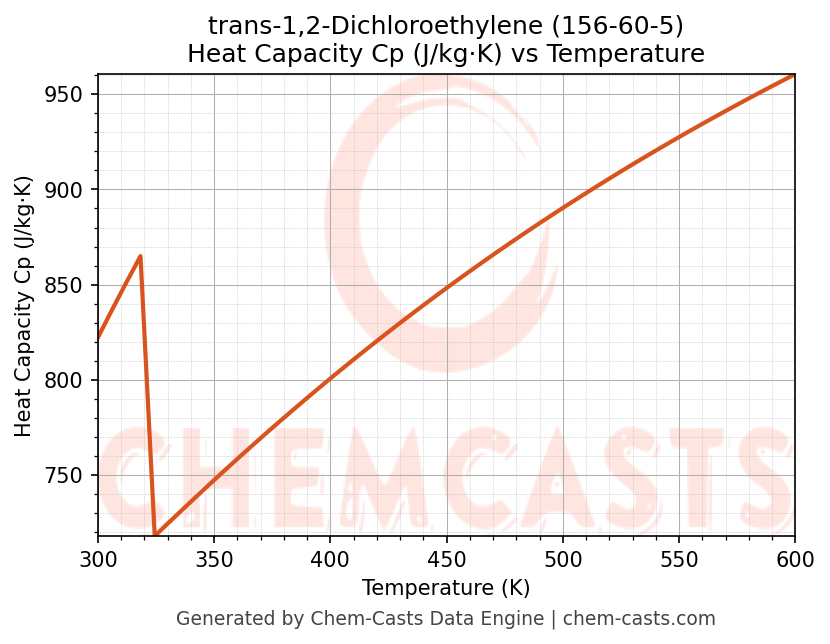 - Specific heat capacity (Cp) indicates the amount of energy required to raise the temperature of trans-1,2-Dichloroethylene and is critical for energy balance and heat-exchanger design.