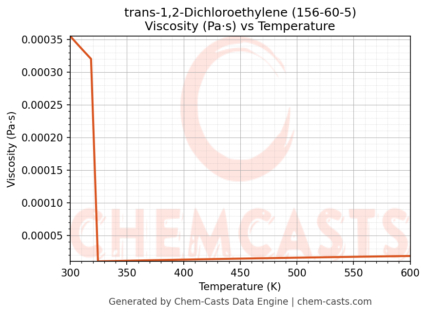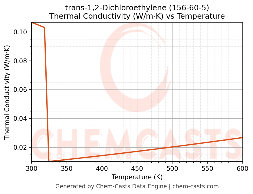 This page presents the temperature-dependent thermodynamic and transport properties of trans-1,2-Dichloroethylene (CAS 156-60-5) calculated at a constant pressure of 1 atm (101325 Pa) over the temperature range 250-500 K.