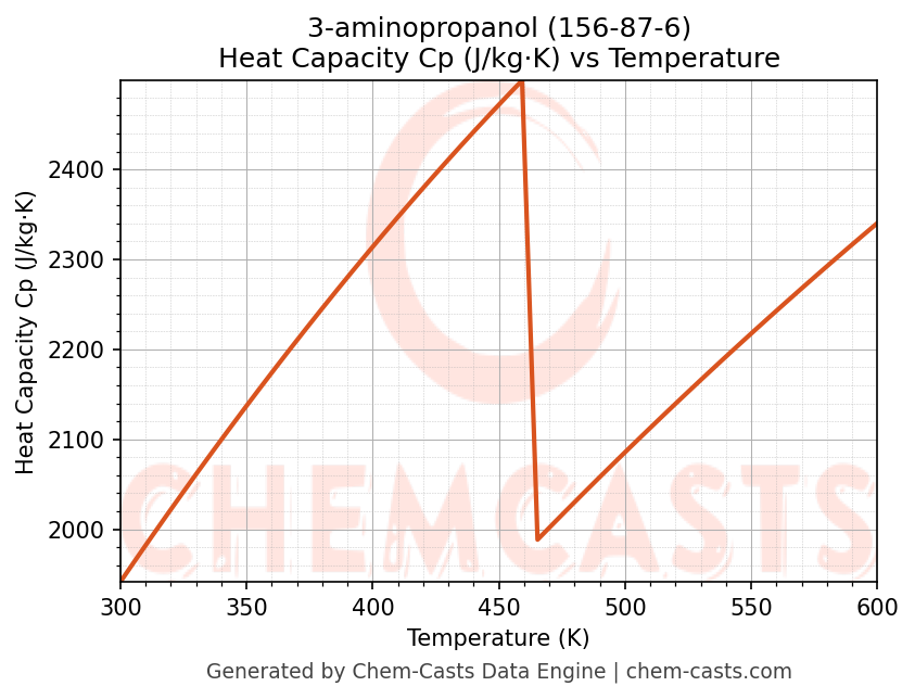 - Specific heat capacity (Cp) indicates the amount of energy required to raise the temperature of 3-aminopropanol and is critical for energy balance and heat-exchanger design.