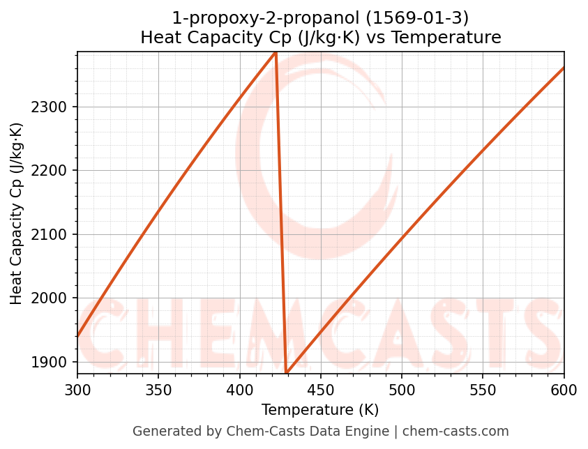 - Specific heat capacity (Cp) indicates the amount of energy required to raise the temperature of 1-propoxy-2-propanol and is critical for energy balance and heat-exchanger design.