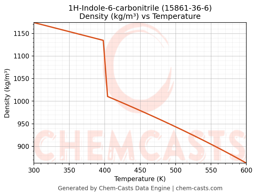 This page presents the temperature-dependent thermodynamic and transport properties of 1H-Indole-6-carbonitrile (CAS 15861-36-6) calculated at a constant pressure of 1 atm (101325 Pa) over the temperature range 250-500 K.