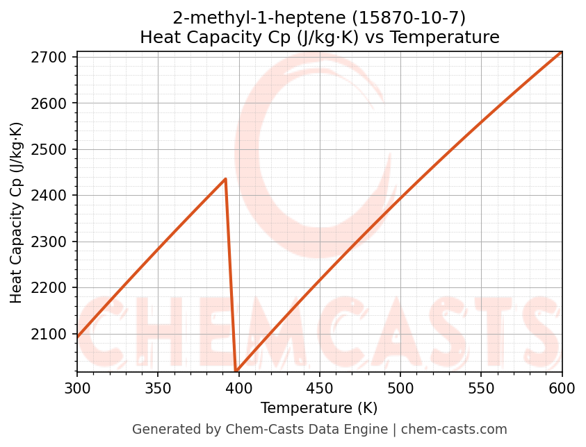 - Specific heat capacity (Cp) indicates the amount of energy required to raise the temperature of 2-methyl-1-heptene and is critical for energy balance and heat-exchanger design.