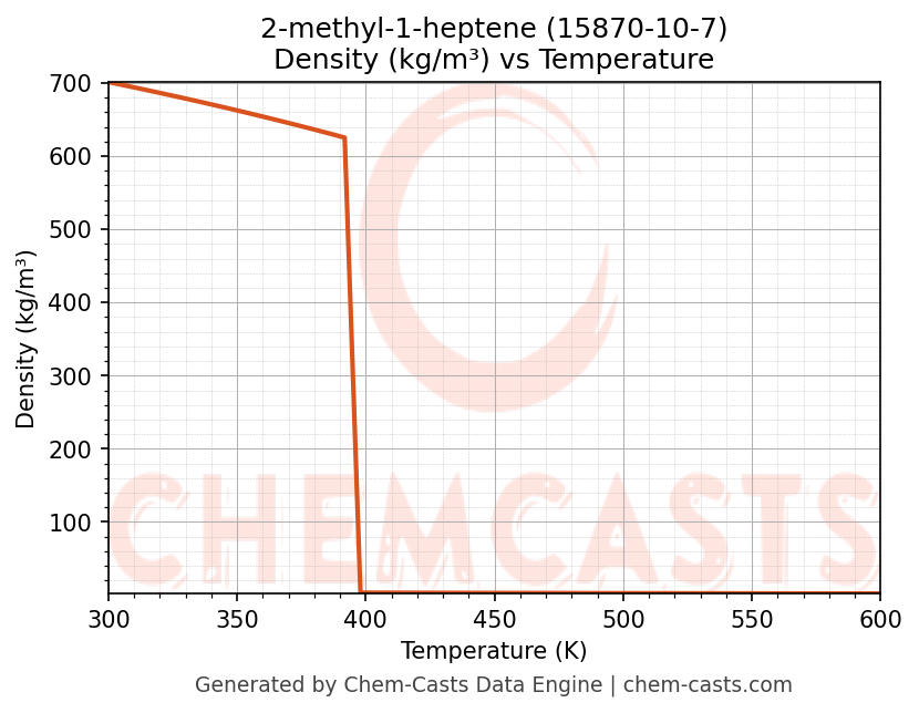 This page presents the temperature-dependent thermodynamic and transport properties of 2-methyl-1-heptene (CAS 15870-10-7) calculated at a constant pressure of 1 atm (101325 Pa) over the temperature range 250-500 K.