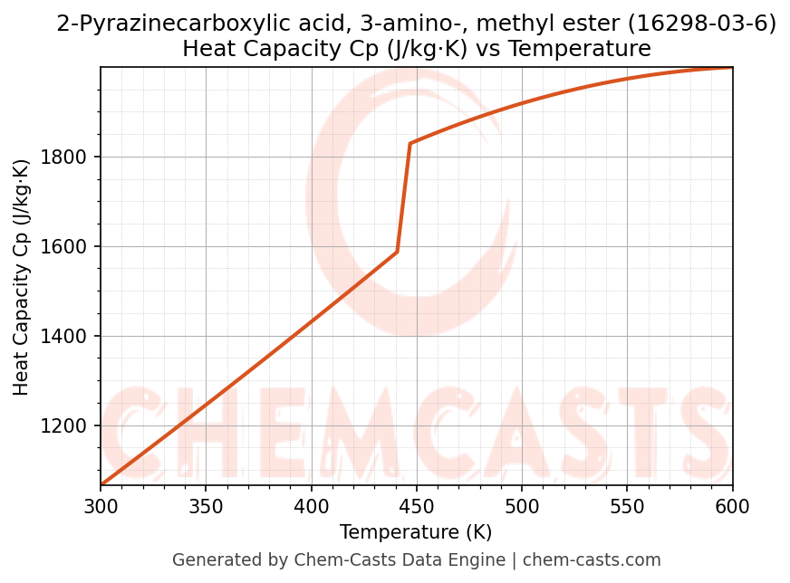 - Specific heat capacity (Cp) indicates the amount of energy required to raise the temperature of 2-Pyrazinecarboxylic acid, 3-amino-, methyl ester and is critical for energy balance and heat-exchanger design.