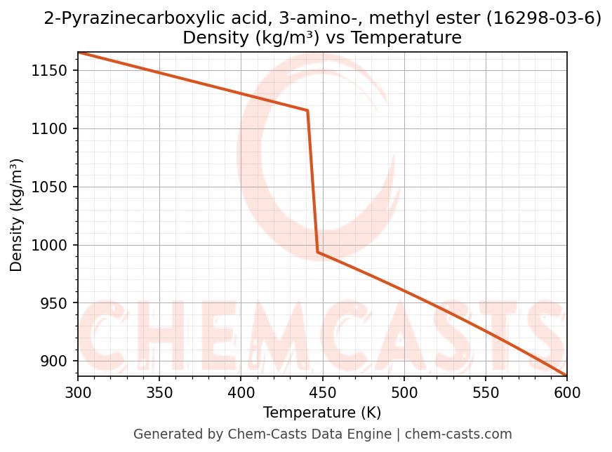 This page presents the temperature-dependent thermodynamic and transport properties of 2-Pyrazinecarboxylic acid, 3-amino-, methyl ester (CAS 16298-03-6) calculated at a constant pressure of 1 atm (101325 Pa) over the temperature range 250-500 K.
