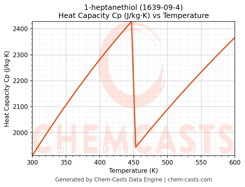 - Specific heat capacity (Cp) indicates the amount of energy required to raise the temperature of 1-heptanethiol and is critical for energy balance and heat-exchanger design.