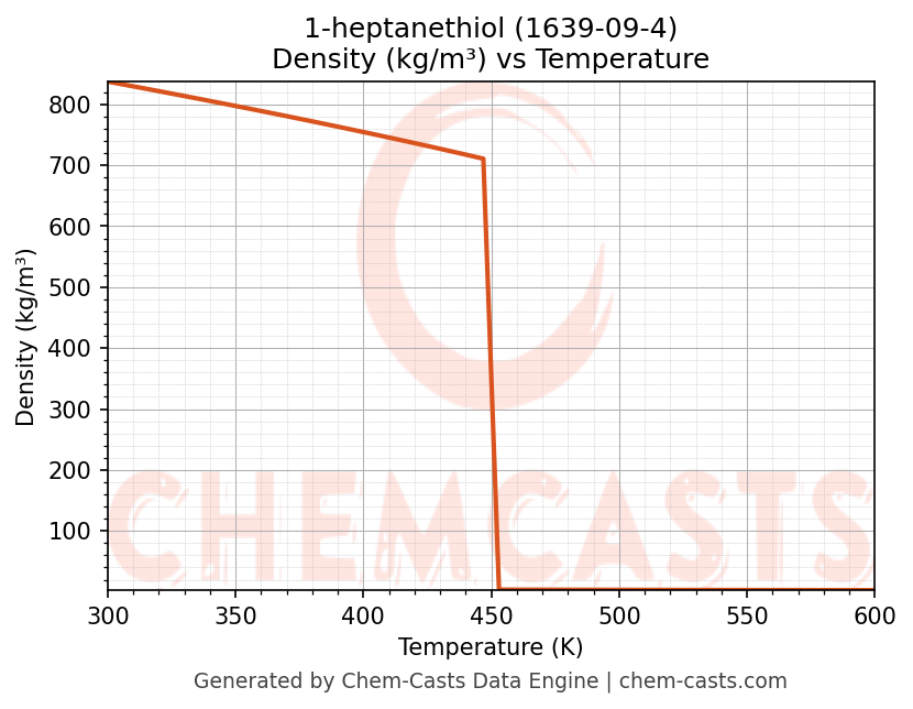 This page presents the temperature-dependent thermodynamic and transport properties of 1-heptanethiol (CAS 1639-09-4) calculated at a constant pressure of 1 atm (101325 Pa) over the temperature range 250-500 K.