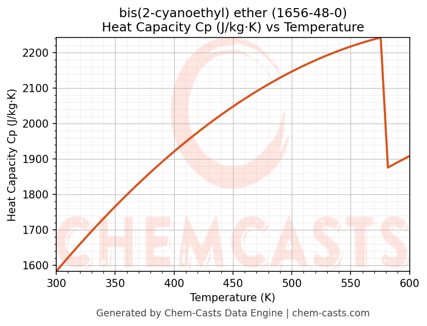 - Specific heat capacity (Cp) indicates the amount of energy required to raise the temperature of bis(2-cyanoethyl) ether and is critical for energy balance and heat-exchanger design.