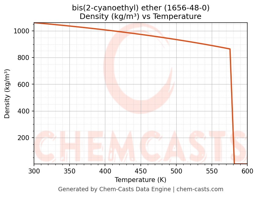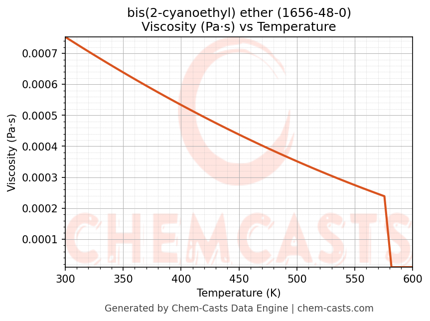 This page presents the temperature-dependent thermodynamic and transport properties of bis(2-cyanoethyl) ether (CAS 1656-48-0) calculated at a constant pressure of 1 atm (101325 Pa) over the temperature range 250-500 K.