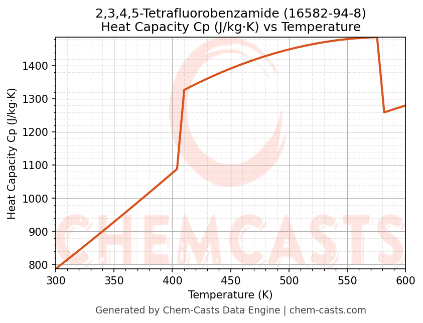 - Specific heat capacity (Cp) indicates the amount of energy required to raise the temperature of 2,3,4,5-Tetrafluorobenzamide and is critical for energy balance and heat-exchanger design.