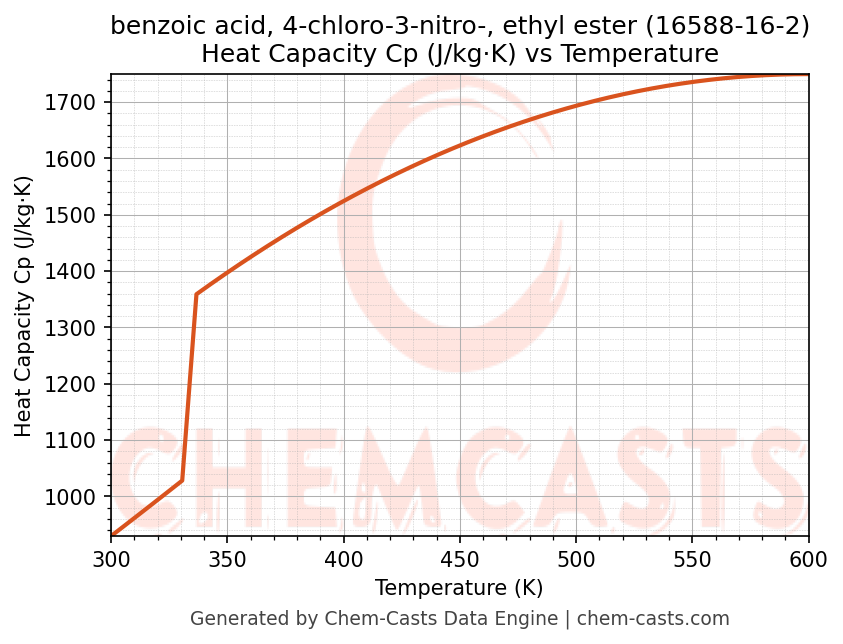 - Specific heat capacity (Cp) indicates the amount of energy required to raise the temperature of benzoic acid, 4-chloro-3-nitro-, ethyl ester and is critical for energy balance and heat-exchanger design.