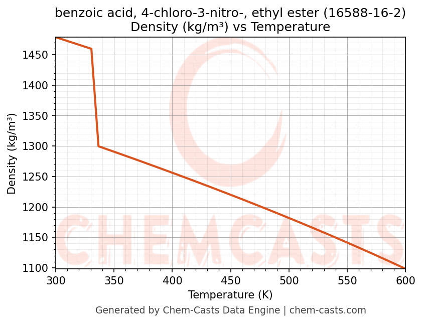 This page presents the temperature-dependent thermodynamic and transport properties of benzoic acid, 4-chloro-3-nitro-, ethyl ester (CAS 16588-16-2) calculated at a constant pressure of 1 atm (101325 Pa) over the temperature range 250-500 K.
