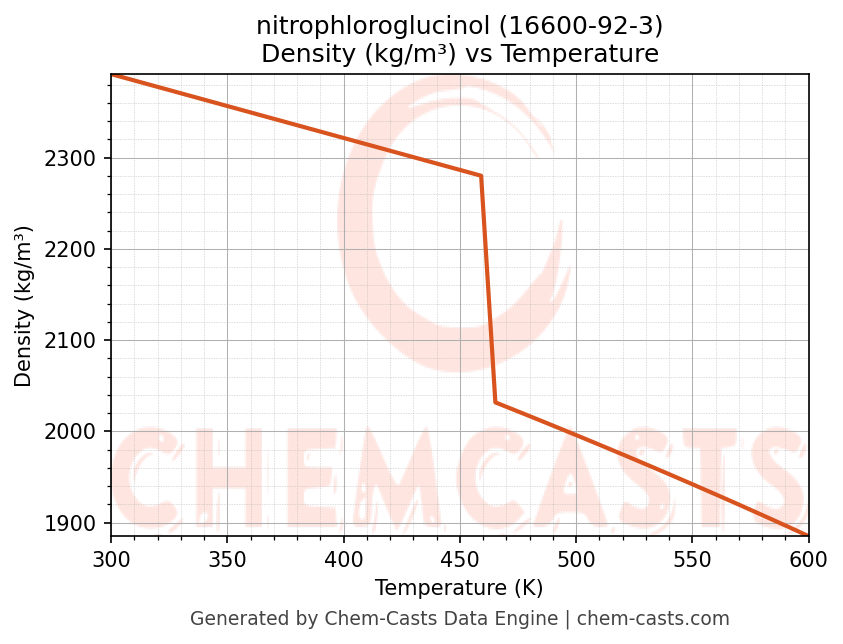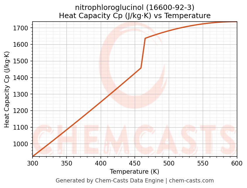 This page presents the temperature-dependent thermodynamic and transport properties of nitrophloroglucinol (CAS 16600-92-3) calculated at a constant pressure of 1 atm (101325 Pa) over the temperature range 250-500 K.