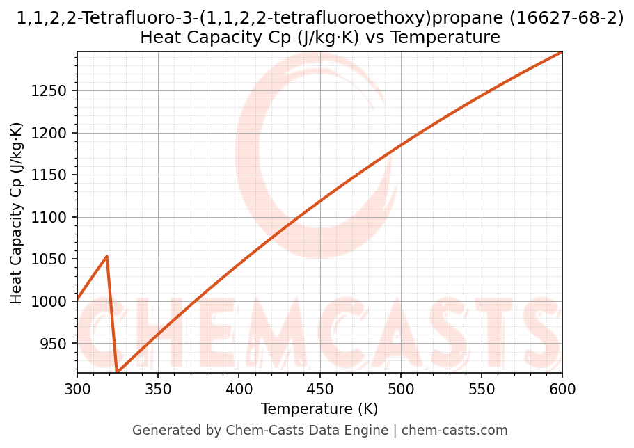 - Specific heat capacity (Cp) indicates the amount of energy required to raise the temperature of 1,1,2,2-Tetrafluoro-3-(1,1,2,2-tetrafluoroethoxy)propane and is critical for energy balance and heat-exchanger design.